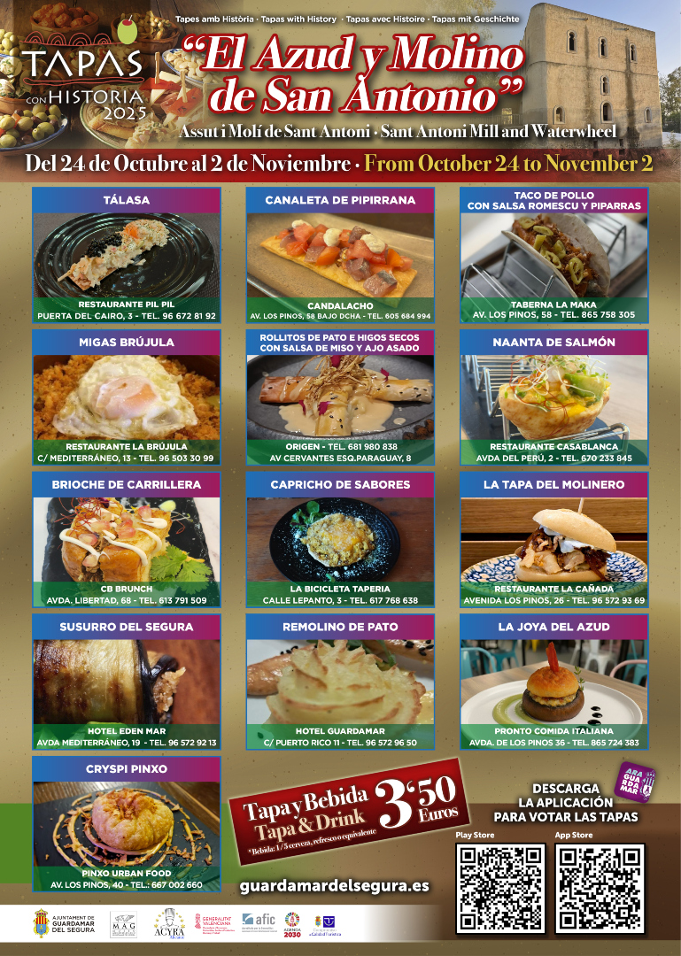 Del 24 de octubre al 2 de noviembre de 2025, Guardamar del Segura se llenará de propuestas culinarias con un sabor especial: cada tapa se inspira en un episodio histórico de la localidad. Este año el protagonista será el Azud y Molino de San Antonio, uno de los símbolos más representativos de la relación de Guardamar con el agua y la agricultura.