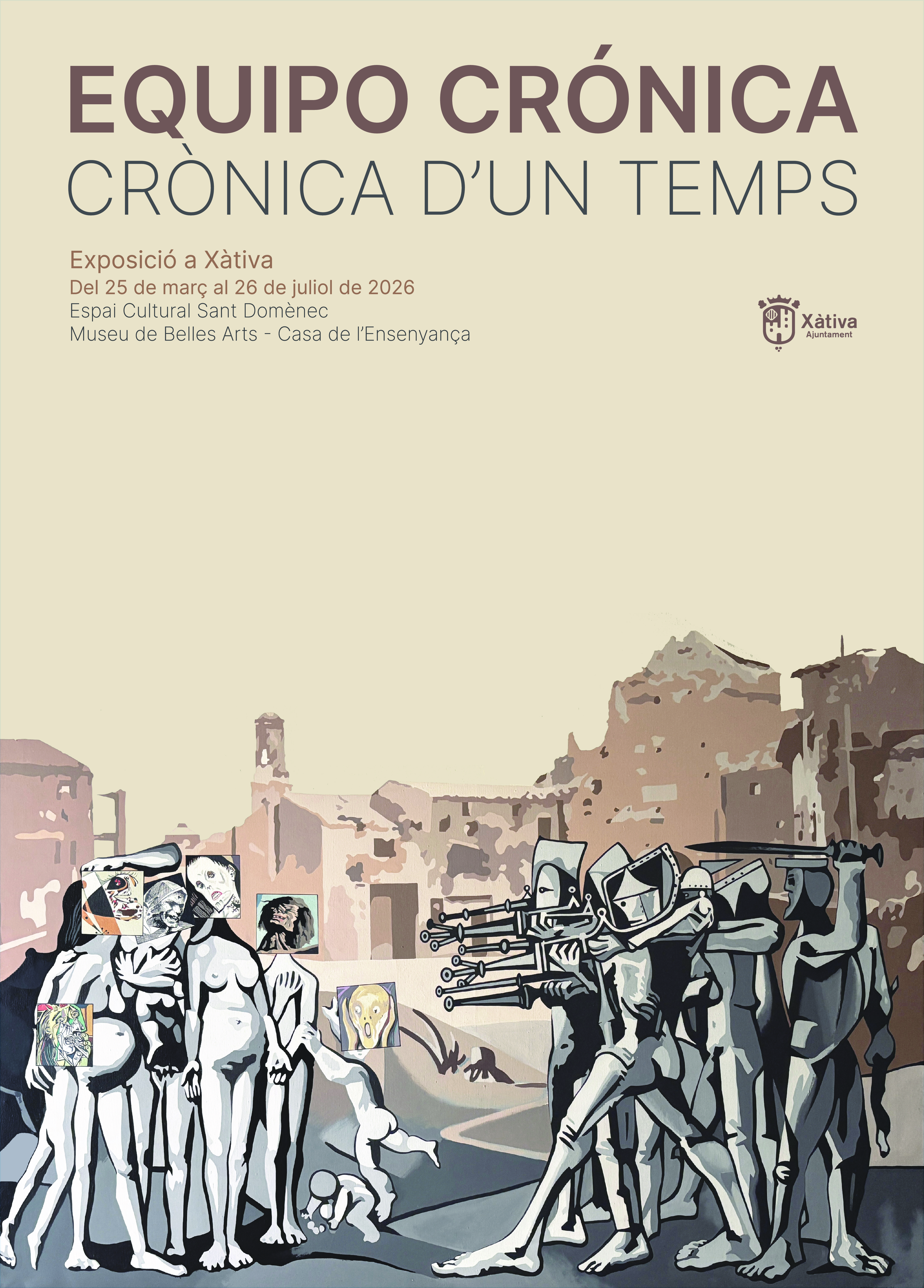 La exposición Equipo Crónica | Crónica de un tiempo propone un recorrido por el universo de este colectivo fundamental en la renovación del arte valenciano y español de la segunda mitad del siglo XX, con influencia internacional y obra formando parte de colecciones de museos de todo el mundo. El proyecto pone en valor el ejercicio de indagación histórico-plástica que los artistas llevaron a cabo a lo largo de los años de trabajo conjunto. Su obra, profundamente arraigada en el contexto político y social de la dictadura y la transición, es también el resultado de un intenso diálogo con otros creadores, pensadores y movimientos que formaban parte del tejido cultural valenciano y europeo del momento.